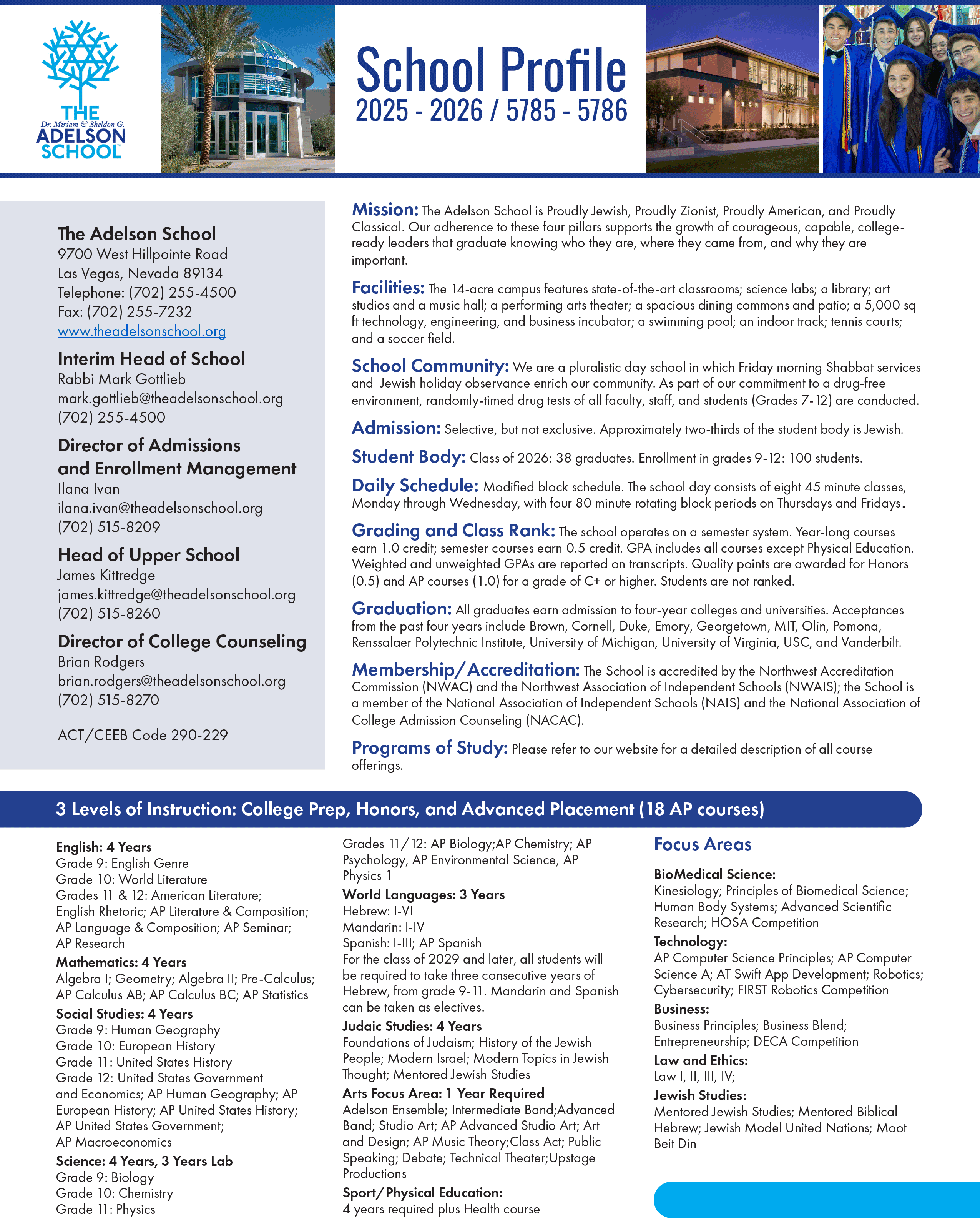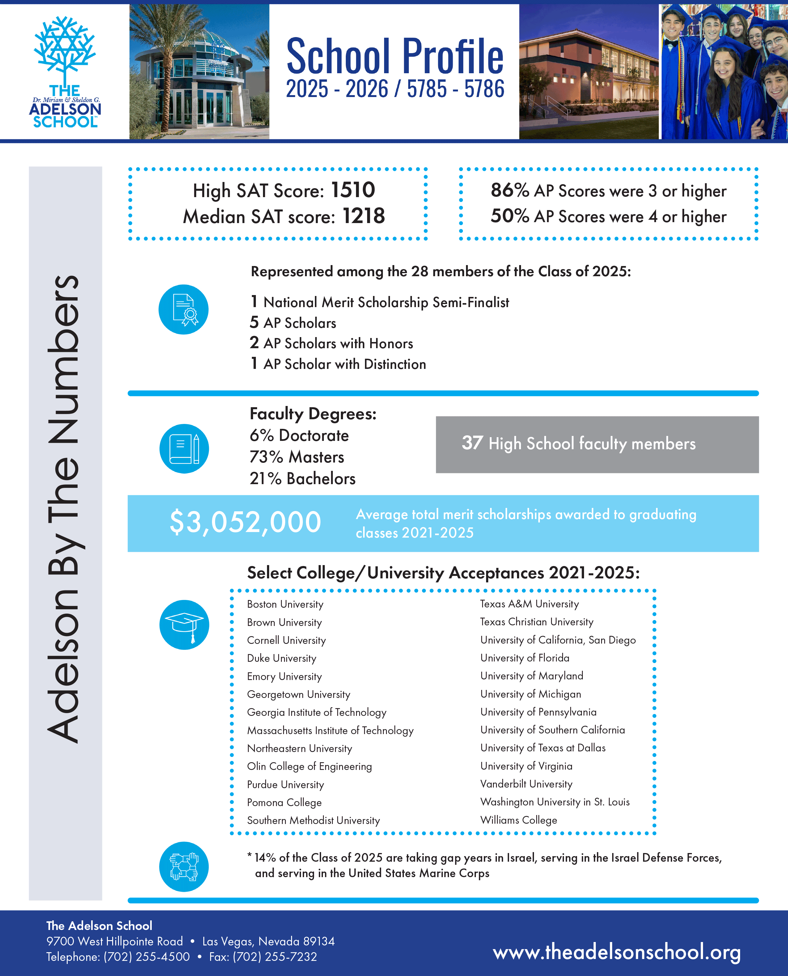 The Adelson School admits qualified students of any race, color, national and ethnic origin, sexual orientation, or gender identity to all the rights, privileges, programs, and activities generally accorded or made available to students at the school. The Adelson School does not discriminate on the basis of race, color, national and ethnic origin, or sexual orientation in the administration of its educational policies, admissions policies, scholarship and loan programs, and athletic and other school-administered programs.